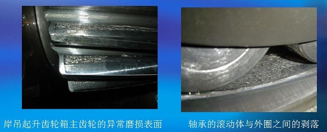 (3)采取措施與反饋信息:為避免重大事故的發生,建議該港口立即對該岸吊齒輪箱進行停機檢修,下圖為該齒輪箱解體后的照片,從照片可見,該岸吊起升齒輪箱主齒輪的齒根部到節線處有明顯的點蝕現象,而二、三級軸承的滾動體與外圈之間也發生了嚴重的疲勞剝落現象。同時對其他有類似情況的設備縮短監測周期,實行重點監控。該齒輪箱經維修后,已投入正常生產中,運行狀況良好。