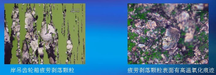 (C)鐵譜磨損分析:下圖為2008年3月該齒輪箱的異常磨損金屬顆粒的鐵譜圖片,從圖中可見,油中有大量的鋼質疲勞剝落磨損金屬顆粒,部分顆粒表面還有明顯的高溫氧化痕跡,表明該齒輪箱發生了嚴重異常磨損。