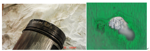 上海某局某機械段大型養路機械的發動機,大多采用德國道依茨公司的風冷柴油發動機。在長期數據積累中,確定將鐵、鋁、鉛等元素作為監控的重點,當其發生大幅變動時,應引起高度重視。2005年5月起,持續作業的07號搗固車發動機的檢測數據發生顯著變化。部分光譜元素數值見下表。鐵、鋁、鉬等元素數值出現持續增長,前后變動幅值極大。分析鐵譜可觀察到較多30μm至40μm的疲勞磨粒,若干個鋁質疲勞顆粒,最大尺寸達到120μm。此外還可見較多黑色氧化物磨粒等。檢測人員向設備管理和施工使用部門提出異常警報,要求停機檢查。由于施工任務極其緊張,該機一直未能予以調整檢修。7月份的光譜測試數值有所下降,其原因是現場技術人員在獲知存在部件故障警報情況下的臨時換油所致。在8月初的施工間歇期,機械進入基地檢修,發現第12缸的第一道活塞環咬死,活塞頂破損并且存在過燒跡象,若干個活塞缸套出現不同程度的拉傷,見下圖。