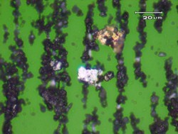 在顯微鏡下觀察油液鉄譜片,發現有大量的鐵的黑色氧化物顆粒,以及鋼和巴氏合金顆粒,表明軸承已經出現了異常的磨損征兆,而且磨損程度比較嚴重(圖2)。