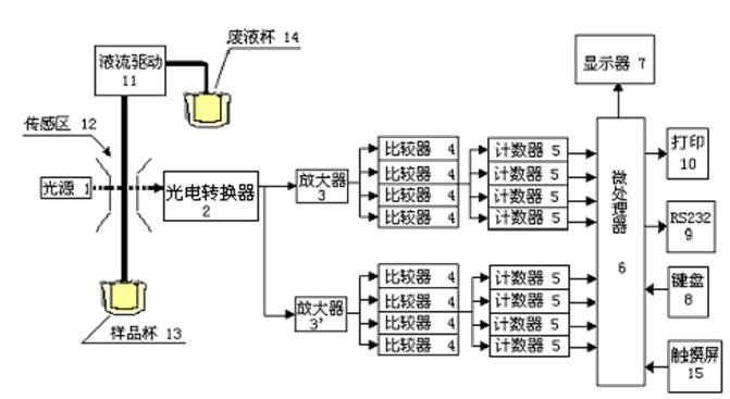 其原理是當液體中的微粒通過一窄小的檢測區時,與流體流向垂直的入射光,由于被具有不同遮光系數的顆粒所阻擋而減弱,從而使傳感器輸出的信號降低,這種信號變化與微粒的截面積成正比。